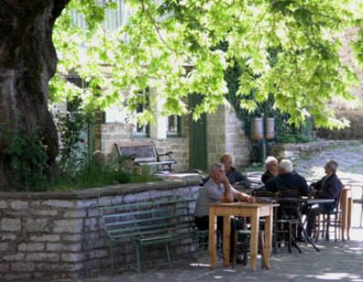 La place du village, à l'ombre de hauts platanes centenaires, bordée de restaurants et cafés
