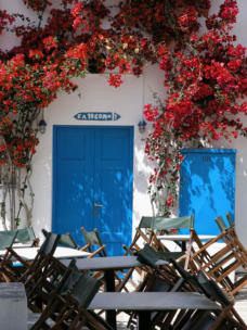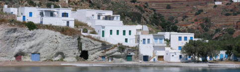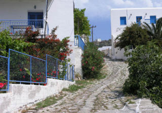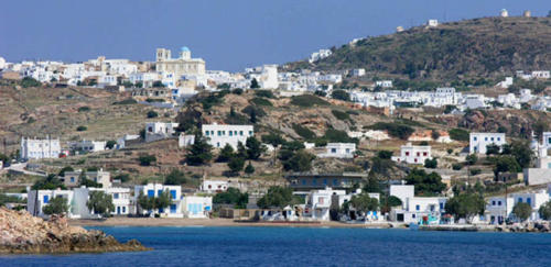 Psathi, le port de l’île, dominé par la capitale aux maisons blanches, rues