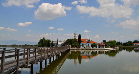 Le monastère St-Nicolas de Porto Lagos construit sur un îlot au centre du lac, offre un paysage idyllique . La flore et la faune de la région est extrêmement riche... le monastère aussi ! C’est un des plus riches couvent de la République monastique, situé en Chalcidique