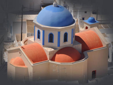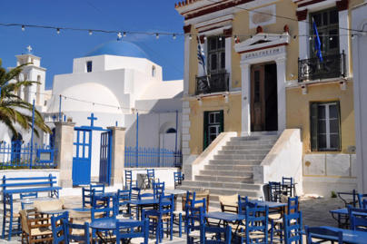 La mairie (dimarkhion) , un bâtiment de style néoclassique datant de la fin du XIXème siècle, jouxte l'église d'Agios Athanassiou qui est la cathédrale de l'île