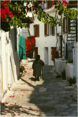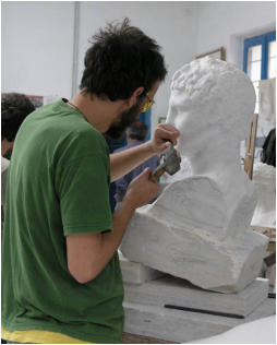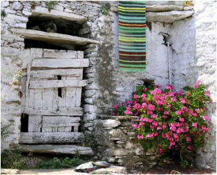 A Pirghos,  tout est marbre -  escaliers, fontaines, tombes... - on succombe au charme des petites ruelles... Ci-contre, un élève de l’école des Beaux-Arts
